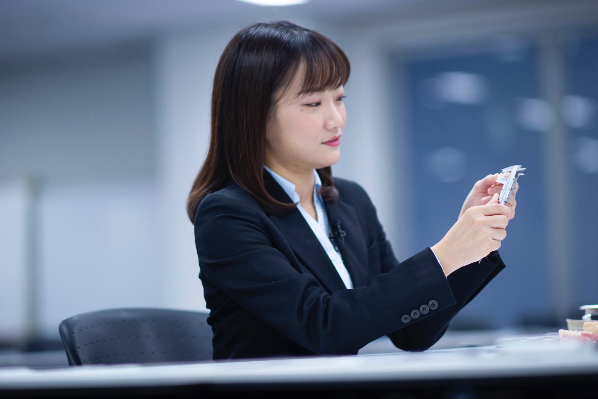 これまで補綴(ほてつ)物は歯科技工士が手作業で製造するのが通常でしたが、ミリングマシンでは、機械を使うことで半分以下の時間で製品を完成させることができます。キヤノン電子のミリングマシンは、金属や樹脂を加工できる工業用加工機の「固いものを早く削る」技術を活かした、画期的なマシンです。設計業務はまだ知識がないので苦労していますが、技工士としての意見を先輩方に求められたときは大学で学んできた知識を活かして答えることができるので、やりがいを感じます。歯科や歯科技工所の方と打ち合わせをするときは、専門用語の解説者にもなります。