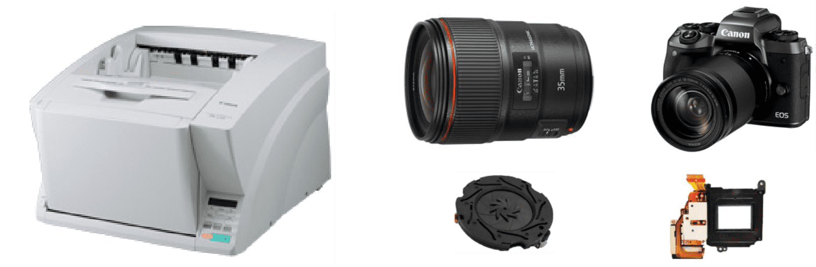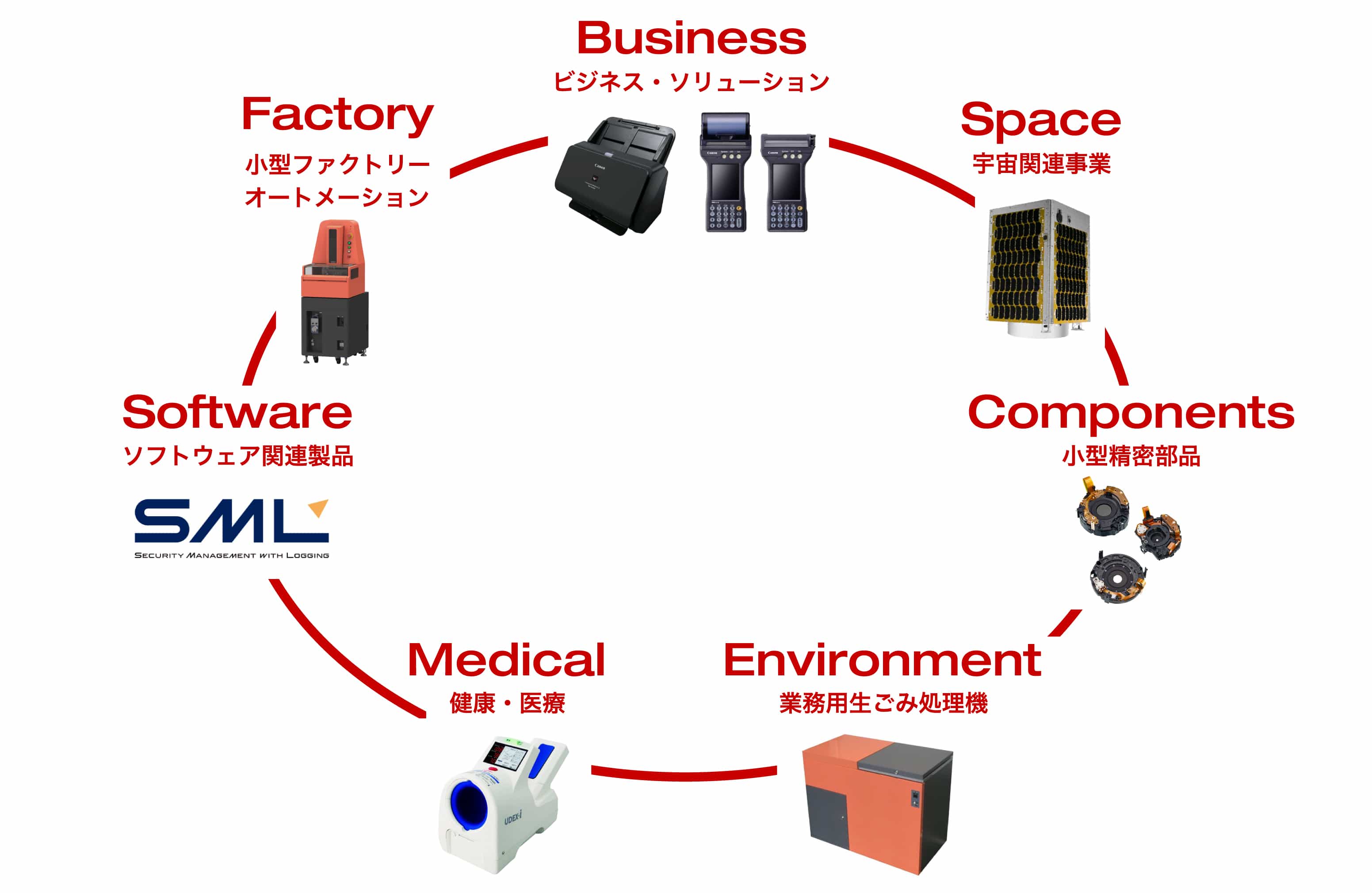 キヤノン電子では、高品質・高生産性・技術力をベースに、ソフトウエア関連製品、産業用小型加工機・成形機、健康医療関連機器、業務用生ごみ処理機といった独自の製品・サービスから、ドキュメントスキャナー、ハンディターミナルといったキヤノングループでの販売を中心とした製品・サービス、カメラのコンポーネントなどの小型精密部品、基板実装受託サービス、最近では宇宙関連事業まで、多岐にわたる事業分野の製品を扱っています。また、特許取得にも積極的に取り組んでいます。