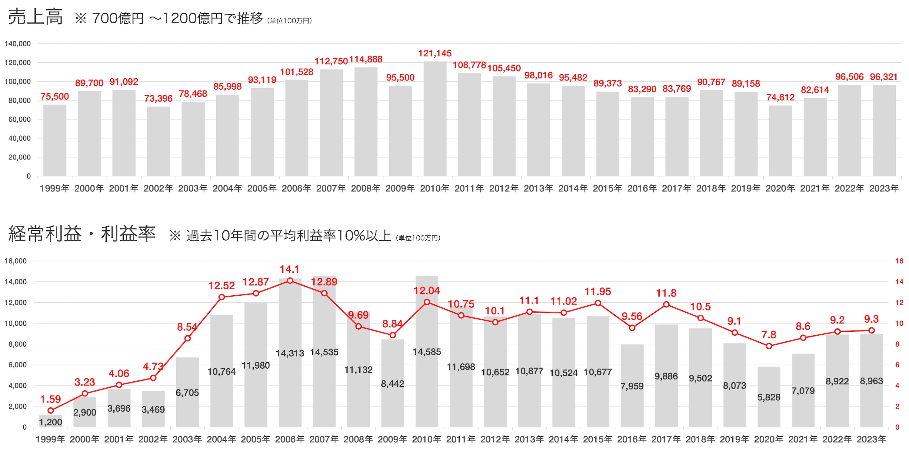 経営ビジョンとして「世界のトップレベルの高収益企業になろう!」を掲げ、常に「生産革新」を行なっています。製造業では、通常3%程度と言われる経常利益率で、10%(10年平均)を誇る高収益経営と企業体質を実現。リーマンショック当時でも8.8%と高く、不況に強い企業です。1999年から比較すると約10倍の利益率を達成しており、今後は20%の利益率目標を掲げています。